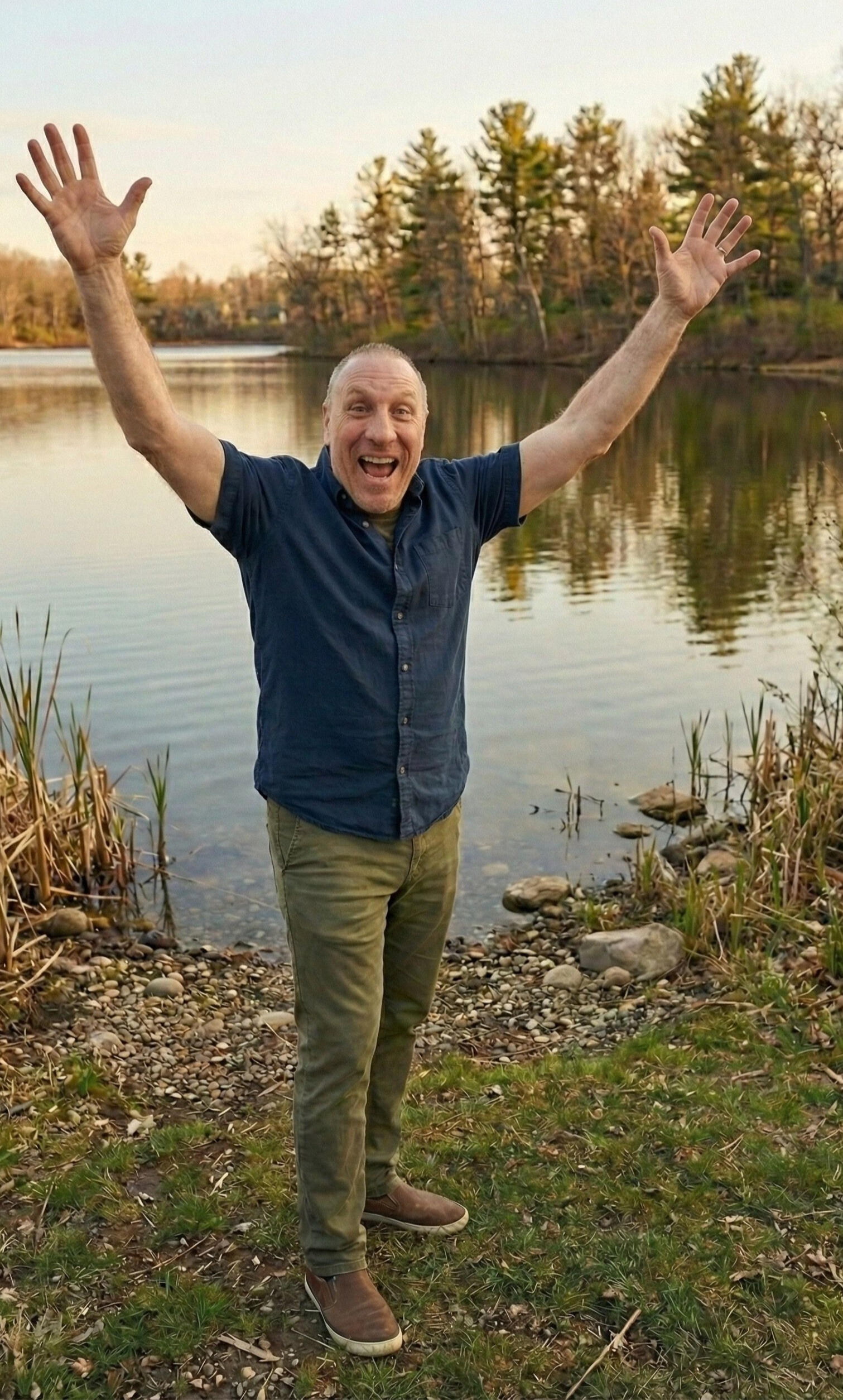 This vibrant acrylic landscape captures the serene, self-contained world of a sun-drenched pond.The composition invites the viewer to the water's edge, where striking turquoise depths meet the lush, textured greens of overhanging foliage.By focusing on the intimate scale of a pond, the painting emphasizes a sense of peaceful seclusion, highlighted by the gentle movement of a waterfowl family navigating the calm surface.The interplay of the glowing sun and the dramatic lean of the central tree creates a sanctuary of light and color, perfect for bringing a breath of fresh air to any space.Artist: Michael J Maione